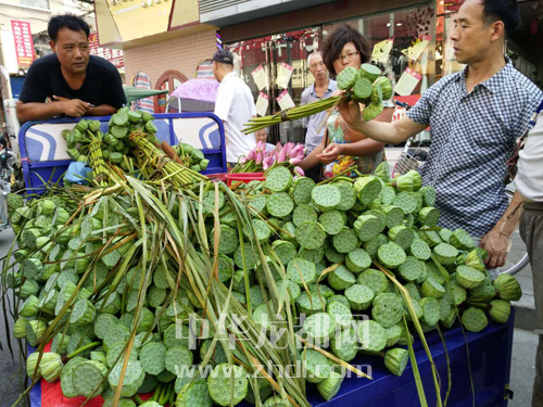????7月25日上午,在周口中心城區(qū)六一路上,一些流動(dòng)攤販正在販賣(mài)荷花、蓮蓬,縷縷清香沁人心脾,引得不少市民爭(zhēng)相購(gòu)買(mǎi)。晚報(bào)記者 朱海龍 攝
