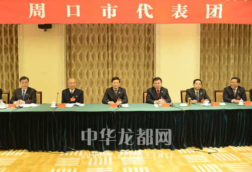 謝伏瞻同志和周口代表團(tuán)成員一起討論省委工作報(bào)告。???記者 王映 攝