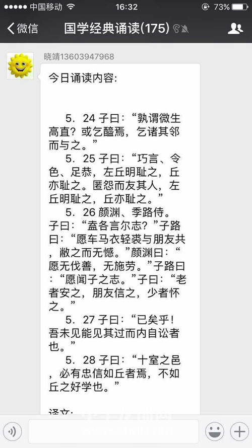 ????建立該微信群的是團(tuán)市委工作人員劉曉靖。劉曉靖告訴周口晚報(bào)記者,建立該微信群的目的是想讓大家多讀讀國(guó)學(xué)經(jīng)典,增加大家的文學(xué)涵養(yǎng),讓大家養(yǎng)成讀書(shū)的習(xí)慣?!皠傞_(kāi)始只有十幾個(gè)人,大家有些不好意思,有的人覺(jué)得自己讀得不好張不開(kāi)口,我就做一些示范,引領(lǐng)大家誦讀。不久,加入微信群的人多了,通過(guò)幾個(gè)人帶動(dòng),大家誦讀的就多了?!眲跃刚f(shuō),讀的方式就是大家通過(guò)微信的語(yǔ)音功能,讀一些《論語(yǔ)》中的經(jīng)典句子。過(guò)了一段時(shí)間,大家對(duì)這種方式越來(lái)越認(rèn)可,加入該微信群的人也越來(lái)越多,人數(shù)從剛開(kāi)始的十幾個(gè)人增加到近200人?,F(xiàn)在,該微信群里不但有電臺(tái)、電視臺(tái)的專(zhuān)業(yè)主持人,而且有一些學(xué)者。以前拿不準(zhǔn)的字,現(xiàn)在都會(huì)有人講解,大家也有了學(xué)習(xí)對(duì)象。這個(gè)微信群從成立到現(xiàn)在,《弟子規(guī)》、《大學(xué)》、《中庸》、《論語(yǔ)》已讀一遍,四書(shū)里面只剩下《孟子》還沒(méi)有讀。