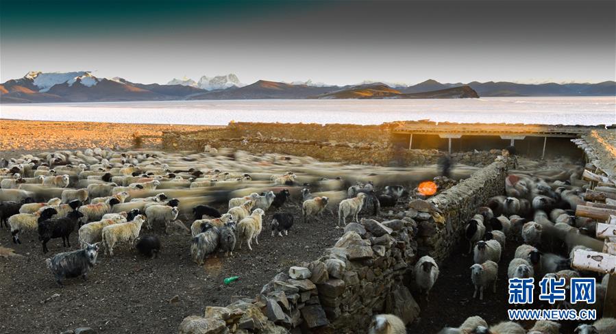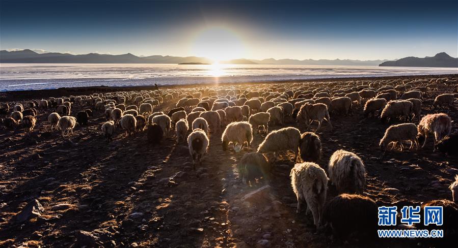 ????一名晚歸的牧羊人在冰封的普姆雍措湖邊。