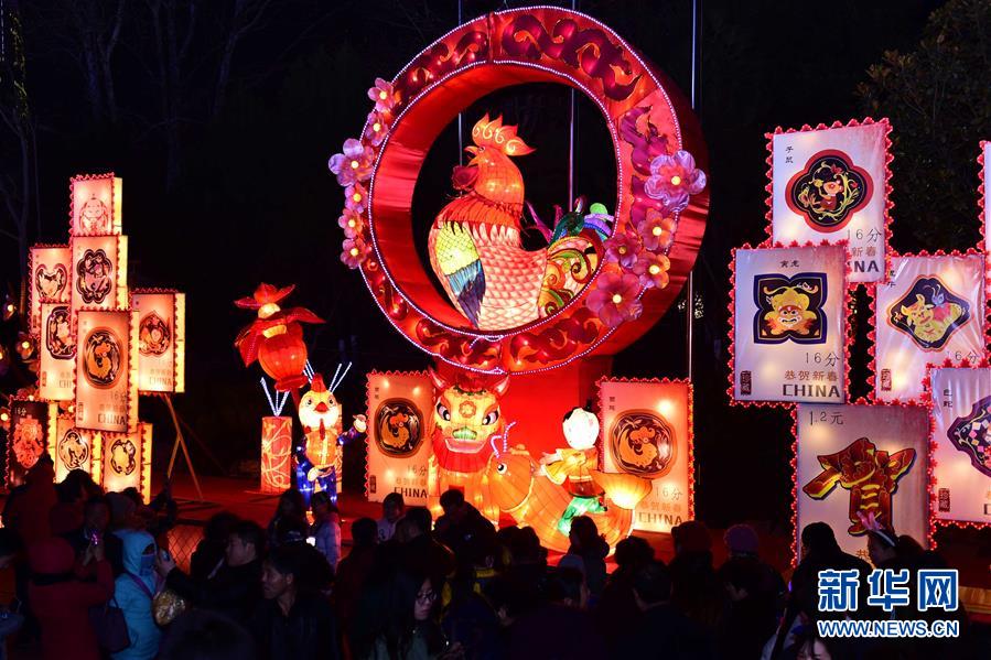 ????2月7日,人們在湖北省宣恩縣貢水河畔觀看彩燈“金雞報曉”。