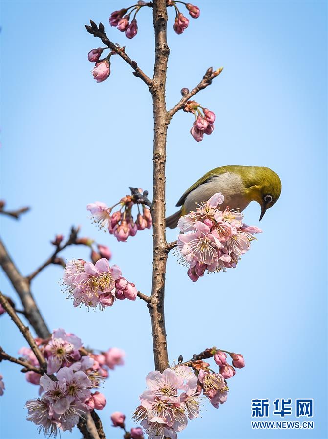 ????2月28日,一只繡眼鳥(niǎo)停在一株櫻花上。近日,天氣回暖,南京中山植物園內(nèi)櫻花盛開(kāi)。鳥(niǎo)兒與櫻花構(gòu)成春日美景,吸引不少攝影愛(ài)好者前來(lái)拍照。 新華社記者楊磊 攝