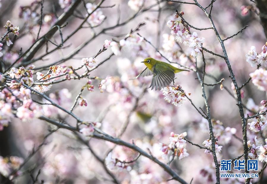 ????2月28日,一只繡眼鳥(niǎo)飛翔在櫻花叢中。