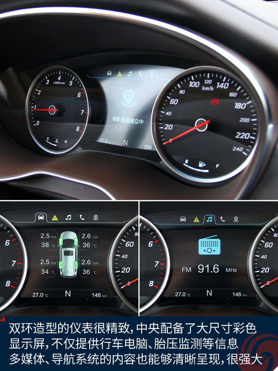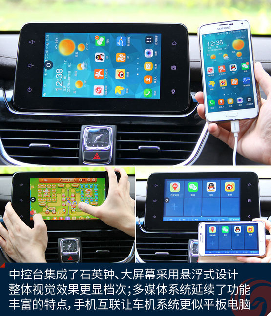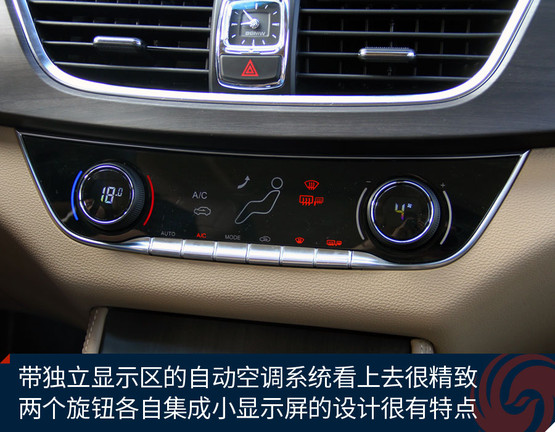 中控臺(tái)中央的大尺寸液晶屏顯示效果挺贊,高清屏、亮度高、色彩艷麗,功能上也足夠強(qiáng)大,收音機(jī)、藍(lán)牙免提、影音播放、GPS導(dǎo)航等等非常全面,前后雷達(dá)、360全景影像也能夠在這里清晰顯示,只可惜手機(jī)互聯(lián)僅支持安卓系統(tǒng),希望日后能有所完善。下方的自動(dòng)空調(diào)控制區(qū)很精致,也很顯檔次。