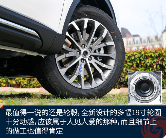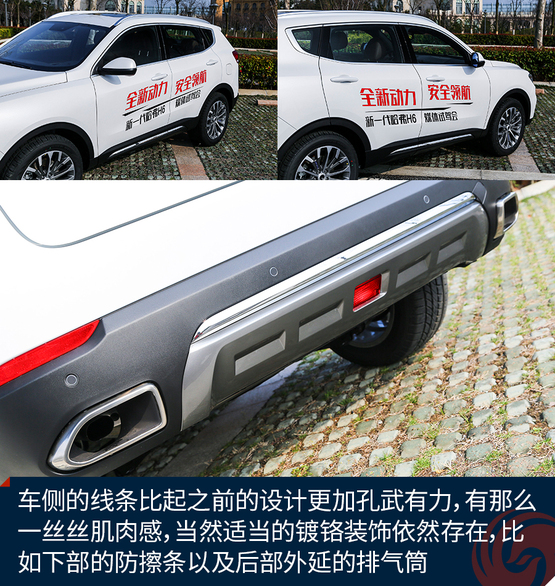 開眼角的設(shè)計(jì)雖然已經(jīng)有一陣子了,但是哈弗H6也是剛剛用上,而且頭燈的設(shè)計(jì)很簡潔,但是與六邊形的前進(jìn)氣格柵搭配的感覺剛剛好,在視覺上帶來了十分不錯(cuò)的沖擊力。車側(cè)的線條比起之前的設(shè)計(jì)更加孔武有力,有那么一絲絲肌肉感,當(dāng)然適當(dāng)?shù)腻冦t裝飾依然存在,比如下部的防擦條以及后部外延的排氣筒。最值得一說的還是輪轂,全新設(shè)計(jì)的多幅19寸輪圈十分動感,應(yīng)該屬于人見人愛的那種,而且細(xì)節(jié)上的做工也值得肯定。