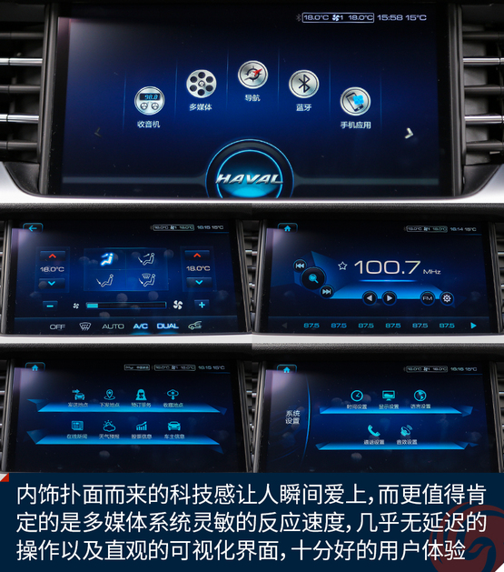如果說外觀給了你第一重驚喜,那么內(nèi)飾的設(shè)計(jì)一定超乎了你對自主品牌的認(rèn)知,至少我認(rèn)為,全新哈弗H6上的這套內(nèi)飾,在設(shè)計(jì)上已經(jīng)超越了很多合資品牌。撲面而來的科技感讓人瞬間愛上,而更值得肯定的是這套多媒體系統(tǒng)靈敏的反應(yīng)速度,幾乎無延遲的操作以及直觀的可視化界面,都帶來十分好的用戶體驗(yàn)。
