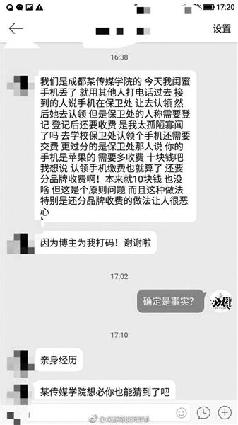 ????認(rèn)領(lǐng)丟失物品需要交費,四川傳媒學(xué)院近日設(shè)立的“失物招領(lǐng)費”在學(xué)子中引發(fā)爭議。日前,該校黨委宣傳部副部長孫浩睿告訴北京青年報記者,學(xué)校并非強(qiáng)制收費,收取的費用將作為對撿拾者的獎金。對此,法律人士表示,制定失物招領(lǐng)收費的規(guī)則不違法,但如果校方強(qiáng)制收取,則涉嫌侵犯學(xué)生財產(chǎn)權(quán),是違法行為。 ????網(wǎng)曝 ????到保衛(wèi)處認(rèn)領(lǐng)丟失手機(jī)需繳費10元 ????近日,四川傳媒學(xué)院有學(xué)生在網(wǎng)上爆料稱,自己陪同學(xué)去學(xué)校保衛(wèi)處認(rèn)領(lǐng)丟失的手機(jī)時,保衛(wèi)處的人員稱需要登記并收取費用,且不同手機(jī)要分品牌收費,蘋果手機(jī)要收費10元。 ????四川傳媒學(xué)院一位學(xué)生告訴北青報記者,他沒有丟過東西,但身邊一位同學(xué)確實曾因丟了一部蘋果手機(jī),向?qū)W校保衛(wèi)處交了10元的“失物招領(lǐng)費”。關(guān)于是否知道學(xué)校設(shè)立了“失物招領(lǐng)費”,這名學(xué)生稱“開學(xué)第一節(jié)課院長就在會議上說過”。 ????4月7日,四川傳媒學(xué)院黨委宣傳部副部長孫浩睿告訴北青報記者,學(xué)校設(shè)立“失物招領(lǐng)費”, “一方面是對拾金不昧行為的肯定,另一方面是想利用這種方式給同學(xué)提個醒,一定注意保管好自己的東西”。 ????孫浩睿向北青報記者解釋,“失物招領(lǐng)費”并不是強(qiáng)制對學(xué)生收取的,“如果學(xué)生不愿意承擔(dān)這部分費用,則由學(xué)校來承擔(dān)”。 ????對于學(xué)校設(shè)立“失物招領(lǐng)費”。有網(wǎng)友表示理解,認(rèn)為學(xué)校的出發(fā)點是好的,也有人認(rèn)為 “物歸原主是規(guī)則”,不應(yīng)該收取費用。此外,也有網(wǎng)友表示,“收錢不重要,重要的是收的錢怎么用,怎么做到透明化?”