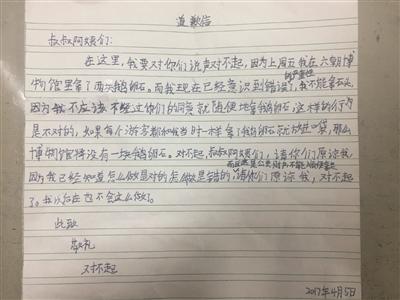 ????孩子的道歉信。 ????揚(yáng)子晚報(bào)訊(記者 張可)南京六朝博物館想尋找一名小觀眾。上月底這個(gè)孩子跟著班級(jí)春游來(lái)博物館參觀時(shí),悄悄拿走了展廳里用于布展的兩塊鵝卵石,幾天后他又帶著道歉信和鵝卵石,回來(lái)承認(rèn)錯(cuò)誤。六朝博物館的工作人員告訴揚(yáng)子晚報(bào)記者,叔叔阿姨們不僅原諒了他,還想表?yè)P(yáng)孩子身上“知錯(cuò)就改”的勇氣、精神,并授予他“名譽(yù)小館員”的稱(chēng)號(hào)。 ????門(mén)口大廳害羞徘徊半天,終于道出實(shí)情 ????南京六朝博物館的安保人員小朱最先注意到這個(gè)孩子。“4月8日下午,看見(jiàn)他在博物館一樓入口處的大廳站了半天,猶猶豫豫的樣子,上去一問(wèn),伸出手遞給我兩塊鵝卵石和一封道歉信?!毙≈旄嬖V揚(yáng)子晚報(bào)記者,孩子看上去很害羞,小臉通紅,說(shuō)要把石頭還回來(lái)。 ????原來(lái),今年3月31日,南京一所小學(xué)的幾個(gè)班級(jí)到六朝博物館參觀,當(dāng)時(shí)這個(gè)孩子悄悄拿走了展廳里鋪在步道旁的鵝卵石。“其實(shí)31日當(dāng)天參觀結(jié)束時(shí),有老師帶著另一個(gè)孩子向售票處的工作人員還了一顆鵝卵石并道歉,但兩個(gè)孩子不是同一個(gè)人?!绷┪镳^的工作人員介紹,后來(lái)在監(jiān)控視頻回看發(fā)現(xiàn),這名送道歉信的孩子是當(dāng)天媽媽騎著電動(dòng)車(chē)送來(lái)的,媽媽一個(gè)人在門(mén)口的人行道上等著,讓孩子自己進(jìn)去說(shuō)。 ????孩子的道歉信寫(xiě)得質(zhì)樸而真切。“在這里,我要對(duì)你們說(shuō)聲對(duì)不起……我不應(yīng)該不經(jīng)過(guò)你們的同意就隨便地拿走鵝卵石……如果每個(gè)游客都和我當(dāng)時(shí)一樣拿了鵝卵石就放進(jìn)口袋,那么博物館將沒(méi)有一塊鵝卵石……請(qǐng)你們?cè)徫?,?duì)不起了,我以后在(注:原文如此)也不會(huì)這么做了。”