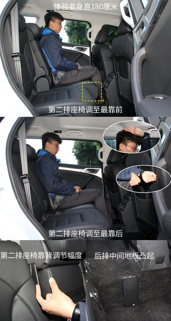 關(guān)于第二排,最重要的當然要數(shù)空間了。剛一坐到第二排之后,感覺確實是很寬敞,不僅腿部空間毫無壓力,頭部空間也完全沒有壓抑感,而且,第二排座椅還支持四向調(diào)節(jié),即座椅前后調(diào)節(jié)和靠背角度調(diào)節(jié),在第三排沒人乘坐的情況下,第二排乘客基本可以找到N種舒服姿勢來應(yīng)對長途乘坐。只不過,第二排的中間地板凸起較高,一定程度上影響了中間乘客乘坐的舒適度。