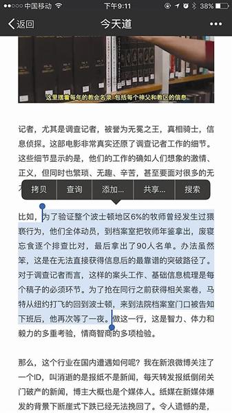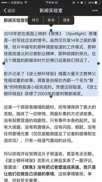 ????昨天,一名賓夕法尼亞大學(xué)的博士生在其微信公眾號上發(fā)文稱,自己2016年1月發(fā)在“新聞實驗室”的公號文章與河北傳媒學(xué)院徐文靜老師在2016年6月發(fā)表的學(xué)術(shù)論文雷同。北青報記者調(diào)查發(fā)現(xiàn),被舉報雷同的論文的22個段落中,與“新聞實驗室”的文章雷同的有18段,另有4個段落分別與新浪娛樂的一篇電影評論以及微信公眾號“今天道”的一篇文章的相應(yīng)章節(jié)雷同。昨天下午,河北傳媒學(xué)院宣傳部的工作人員告訴北青報記者,學(xué)校相關(guān)領(lǐng)導(dǎo)已經(jīng)找徐文靜進行了談話,并第一時間展開調(diào)查,最終會查實情況做出處理意見。 ???? ????微信公號《今天道》原文 ????傳媒老師論文被指照抄 ????昨天上午,微信公眾號“新聞實驗室”發(fā)布了一篇公告,公告的作者是一名賓夕法尼亞大學(xué)的博士生,他表示自己近日發(fā)現(xiàn),河北傳媒學(xué)院一名叫徐文靜的老師于學(xué)術(shù)刊物《青年文學(xué)家》2016年第17期上發(fā)布了一篇標(biāo)題為《從電影<聚焦>看記者的采訪技巧》的文章,內(nèi)容與他2016年1月發(fā)布的《獲普利策獎的調(diào)查報道是怎么做的?這部電影就是一本教科書》的文字多處雷同?!皫缀跏俏掖饲鞍l(fā)布的文章的翻版,只是刪除了少許段落而已?!?/p> ????《青年文學(xué)家》雜志的版權(quán)信息顯示,該雜志為旬刊,2016年第17期在當(dāng)年6月份出版。北青報記者獲取了涉事論文,徐文靜是這篇論文的唯一署名作者。作者簡介中介紹,生于1980年的徐文靜為河北衡水人,碩士,目前是河北傳媒學(xué)院講師,研究方向為新聞實務(wù)和媒介融合。 ????北青報記者比較了徐文靜的《從電影<聚焦>看記者的采訪技巧》和“新聞實驗室”的《獲普利策獎的調(diào)查報道是怎么做的?這部電影就是一本教科書》,發(fā)現(xiàn)兩篇文章確有大量雷同。 ????“新聞實驗室”原文共有“團隊合作”、“完善的資料庫”、“不停地采訪,不停地看資料”、“線人”、“采訪技巧”、“利用法律”、“旁觀者視角”、“報社的投入”8個小標(biāo)題。而徐文靜文章的小標(biāo)題依次為“團隊合作”、“完善的資料庫”、“線人的重要性”、“采訪技巧”、“報社的投入”,共5個小標(biāo)題。 ????小標(biāo)題下的內(nèi)容也高度雷同,除去小標(biāo)題,徐文靜的論文全文共有22個自然段,其中18個自然段與“新聞實驗室”雷同。絕大多數(shù)段落文字完全一致,區(qū)別之處主要是一些字詞、標(biāo)點的調(diào)整,如“新聞實驗室”原文中寫道:“記者也不是孤膽英雄——他/她的背后還有編輯?!毙煳撵o論文中相應(yīng)的話是:“記者也不是孤膽英雄,他的背后還有編輯?!?/p> ??? ????被指抄襲的論文 ????涉事論文由三篇文章“構(gòu)成” ????北青報記者調(diào)查發(fā)現(xiàn),徐文靜論文的22個自然段中,除了18個自然段和“新聞實驗室”2016年1月發(fā)布的文章雷同外,另外4個自然段,也可以在網(wǎng)上找到出處。 ????在小標(biāo)題“采訪技巧”下的內(nèi)容中,論文用3個自然段講述了影片中兩名演員的一段“交叉采訪戲”,這段內(nèi)容出現(xiàn)在新浪娛樂2015年9月發(fā)布的一篇影評文章中。 ????2015年9月,電影《聚焦》在威尼斯電影節(jié)舉行首映式,第二天一名新浪娛樂深度策劃編輯發(fā)表了一篇題為《<聚焦>:一曲唱給傳統(tǒng)媒體記者的贊歌》,文中記述了影片中的那段“交叉采訪戲”。北青報記者對比發(fā)現(xiàn),徐文靜論文中的3個自然段與《<聚焦>:一曲唱給傳統(tǒng)媒體記者的贊歌》中的相應(yīng)段落幾乎一字不差。 ????昨天下午,《<聚焦>:一曲唱給傳統(tǒng)媒體記者的贊歌》的作者在接受北青報記者采訪時表示,該文章是其為電影《聚焦》首映式撰寫的影評,首映式第二天便在新浪娛樂網(wǎng)站上發(fā)布。作者對北青報記者表示:“文章是我獨立撰寫的,我并不認識徐文靜這個人,她沒有參與到這篇文章的寫作,我們也沒有給她任何授權(quán)?!?/p> ???? ????微信公號《新聞實驗室》原文