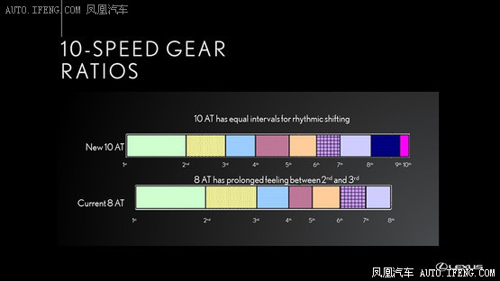 與發(fā)動機匹配的就是世界上首款10速自動變速器,這款變速器是在8檔變速器的二擋和三擋之間增加一個齒比擋位,全部10擋之間保持均勻的齒比間隔,換擋節(jié)奏感十分強,而且換擋時間僅為0.2秒,已經(jīng)達(dá)到雙離合變速器的水準(zhǔn)。