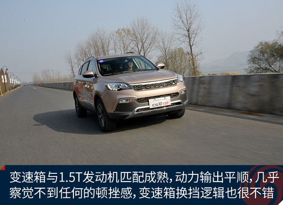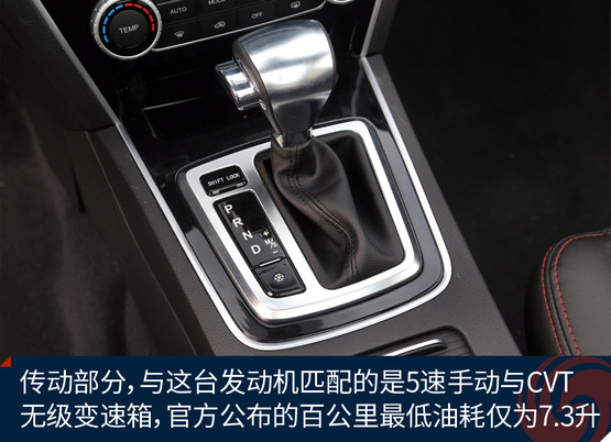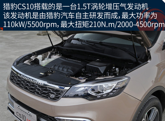本次我們?cè)囻{的獵豹CS10搭載了一臺(tái)1.5T渦輪增壓氣發(fā)動(dòng)機(jī),最大功率為110kW/5500rpm,最大扭矩為210N.m/2000-4500rpm。傳動(dòng)部分,與這臺(tái)發(fā)動(dòng)機(jī)匹配的是5速手動(dòng)與CVT無(wú)級(jí)變速箱,并采用前置前驅(qū)的驅(qū)動(dòng)形式。