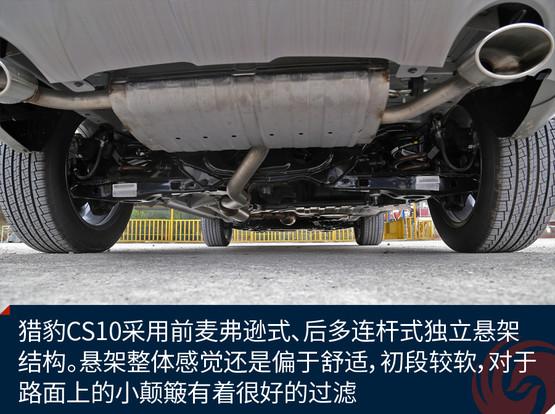 獵豹CS10采用前麥弗遜式、后多連桿式獨(dú)立懸架結(jié)構(gòu),相比同級(jí)別扭力梁車(chē)型多多少少提升了一定的操控感。懸架整體感覺(jué)還是偏于舒適,初段較軟,對(duì)于路面上的小顛簸有著很好的過(guò)濾,在彎中的支撐力也較有韌性,過(guò)彎時(shí)的側(cè)傾控制的比較不錯(cuò)。