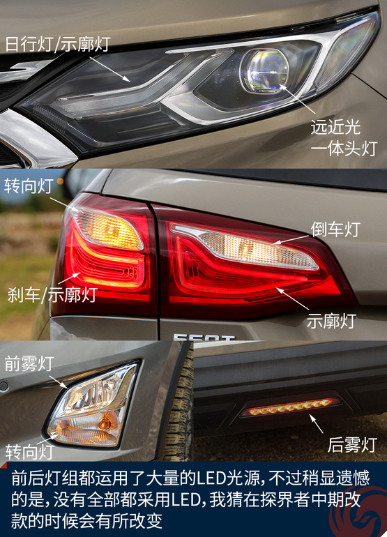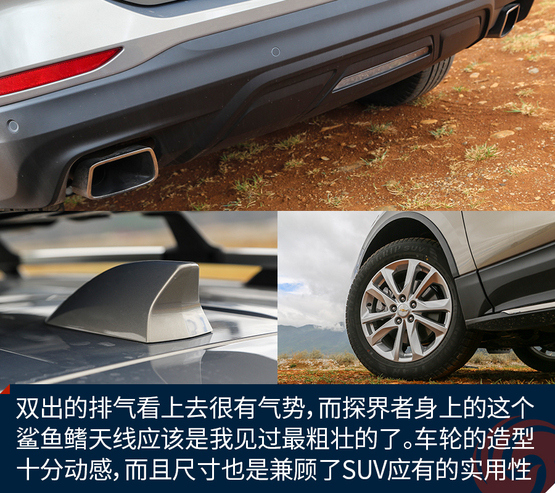 外觀上令我印象深刻的地方有這么幾個(gè),首先前后燈組都運(yùn)用了大量的LED光源,不過稍顯遺憾的是,沒有全部都采用LED,我猜在探界者中期改款的時(shí)候會(huì)有所改變。四個(gè)車門下部包邊的設(shè)計(jì)能夠減少下車弄臟褲腿時(shí)的尷尬。車頂?shù)男欣罴苷娴目捎茫覔?jù)說早期購買探界者的朋友還能獲得車頂?shù)男欣钕?,十分?shí)用。雙出的排氣看上去很有氣勢(shì),而探界者身上的這個(gè)鯊魚鰭天線應(yīng)該是我見過最粗壯的了。車輪的造型十分動(dòng)感,而且尺寸也是兼顧了SUV應(yīng)有的實(shí)用性。