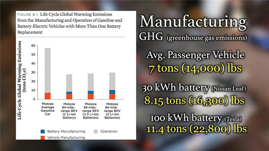 ????????無疑,電池比起傳統(tǒng)內(nèi)燃機排放的溫室氣體要多的多。普通的內(nèi)燃機乘用車在生產(chǎn)過程中會產(chǎn)生7噸的溫室氣體排放,而使用30千瓦時電池的日產(chǎn)聆風會排放8.15噸溫室氣體。至于100千瓦時電池的特斯拉Model S P100D更是會產(chǎn)生11.4噸的溫室氣體。