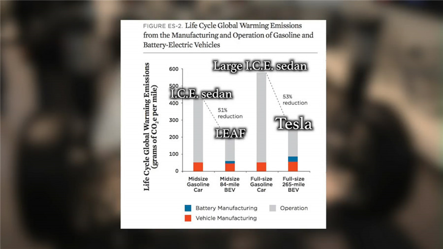 ????????但是如果算上在使用過程中產(chǎn)生的排放,在完整的使用周期中,電動車產(chǎn)生的總排放比內(nèi)燃機汽車就少了一半左右。