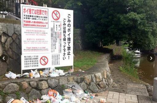 ????在日本京都的鴨川附近,前一天傍晚才清掃干凈,第二天警告看板下又堆滿了垃圾。