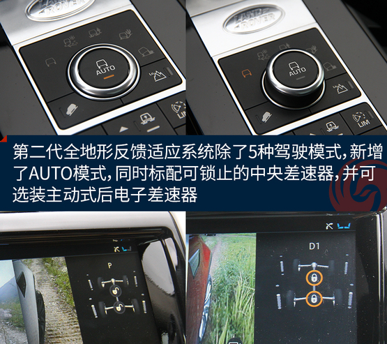 這套第二代全地形反饋適應(yīng)系統(tǒng),提供五種駕駛模式:普通駕駛模式、雪地模式、泥地模式、沙地模式以及攀巖模式。這些放在全新一代發(fā)現(xiàn)上似乎不值一提,不過第二代系統(tǒng)加入了AUTO模式,可自動監(jiān)測行車狀況。同時,第二代系統(tǒng)標(biāo)配可鎖止的中央差速器,并可選裝主動式后電子差速器。