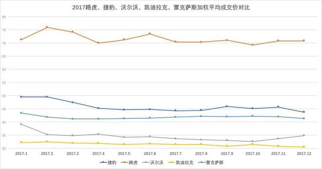 凱迪拉克、捷豹路虎、雷克薩斯、沃爾沃四個品牌銷量在10萬輛以上為第二陣營。除路虎外,捷豹因進口F-pace帶動其成交價上揚,隨著XE國產(chǎn)上市銷售,捷豹銷量有望進一步增長,價格進一步下探;以銷售進口車型為主的雷克薩斯,今年銷量質(zhì)量不錯,庫存時間短,資金周轉(zhuǎn)快,多數(shù)以訂單方式銷售,加權(quán)平均價在42萬上下,成交價格走勢平穩(wěn),經(jīng)銷商今年利潤也很豐厚。沃爾沃在新款車型的帶動下,成交價格開始上揚;凱迪拉克今年銷量增速較快,通過下圖我們可以看到,凱迪拉克基本依靠低價獲取銷量的增長,成交價格進一步走低,經(jīng)銷商的利潤需要依靠廠家補貼。