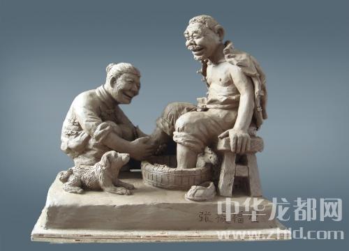 《老來伴》作品長50cm、寬35cm、高46cm。作品表現(xiàn)的是:老漢干了一天的農(nóng)活兒回到家里,老婆用溫水給老漢洗洗腳,消除一天的疲勞,表達(dá)了老夫老妻恩恩愛愛、相濡以沫、白頭偕老。