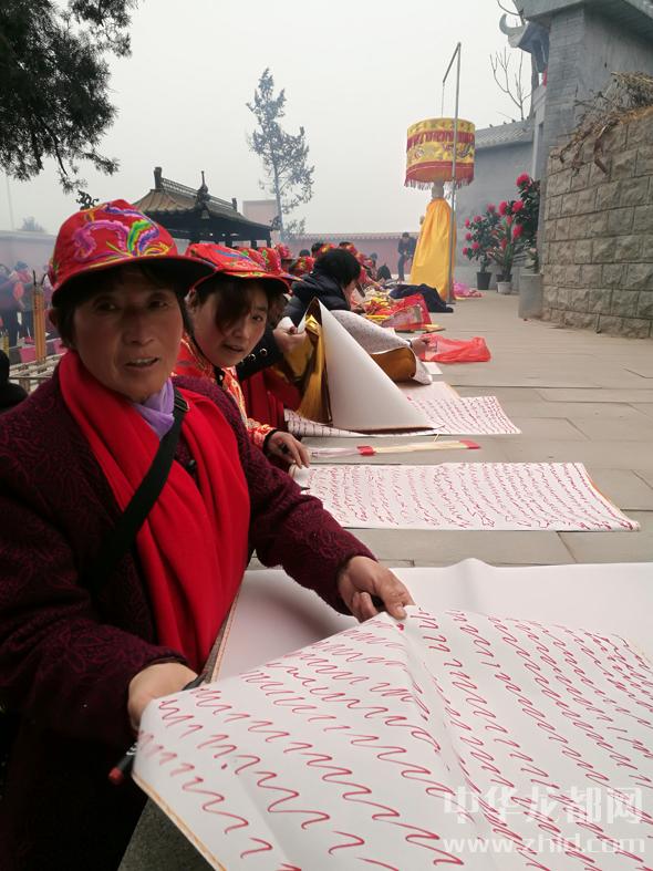 大霧的確延緩了香客的腳步,這也讓晚來(lái)的記者得以看到祭拜的盛景。女?huà)z陵前,十幾名身著統(tǒng)一緞面紅襖,穿黑棉布鞋的女客正在結(jié)伴焚香祭拜,口音明顯和當(dāng)?shù)厝瞬煌K齻兪菑木辔魅A300多公里的濮陽(yáng)范縣、臺(tái)前縣來(lái)的,說(shuō)是凌晨2時(shí)就起身出發(fā),大霧中不僅遭遇堵車(chē),還迷了路,到女?huà)z城都快8時(shí)了。她們這次一起來(lái)的有30多人,分乘4輛車(chē)。就像往常前來(lái)一樣,她們?cè)谂畫(huà)z城要焚香、跪拜、“寫(xiě)賬”(在紙上畫(huà)符,敬奉女?huà)z的一種民間形式)、“守功”(在大殿靜坐,以示對(duì)女?huà)z親近),直至下午方回?!拔覀兠磕炅鲁跻缓团D月初一都來(lái),為啥?信奉女?huà)z娘娘唄,不來(lái)不舒服?!逼渲幸晃豢仔障憧透嬖V記者。