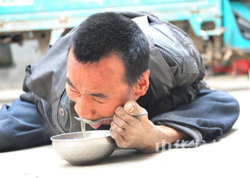 媽媽乘上一碗放在地上,紅印坐在墊子上,用腳夾著勺子,彎下腰來吃得很香??吹郊t印吃飯那么費力,在場人心里酸酸的,為紅印自強不息所打動著??墒钱敵跄飩z可沒少流眼淚,李新蘭發(fā)現(xiàn)兒子兩只腳是靈活完好的,就開始訓練他用腳吃飯、洗臉。養(yǎng)大一個正常的孩子尚且不易,何況是張紅印這樣的孩子?李新蘭一遍遍地教,年幼的張紅印一遍遍地學。難為到受不了時,娘倆就抱在一起哭。