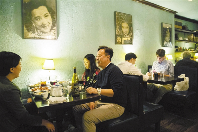 這是食客們在位于美國紐約的“傾城”餐廳享用晚餐(6月27日攝)。來自中國的王怡明和張弦夫婦辭去金融行業(yè)高薪工作,于2011年創(chuàng)辦了這家以張愛玲小說《傾城之戀》為靈感命名的中餐廳,用復古的電影海報和臺燈、照相機等老物件營造出“中西合璧”的老上海風情,多元和含蓄地展示店主鐘愛的文藝氛圍。新華社發(fā)