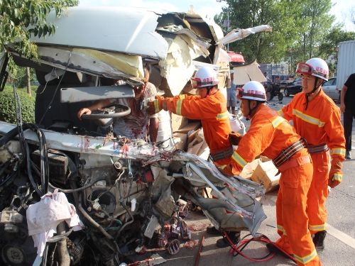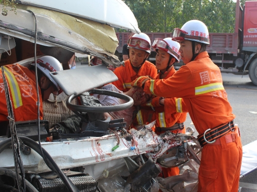 消防官兵一邊對(duì)現(xiàn)場(chǎng)進(jìn)行警戒,一邊實(shí)施破拆營救。由于車頭嚴(yán)重變形,沒有有利救援支撐的空間,給救援帶來很大的困難。指揮員決定利用機(jī)動(dòng)擴(kuò)張剪與液壓頂桿對(duì)駕駛室進(jìn)行擴(kuò)張,待撐出有效救援空間后,迅速對(duì)被困人員進(jìn)行施救。