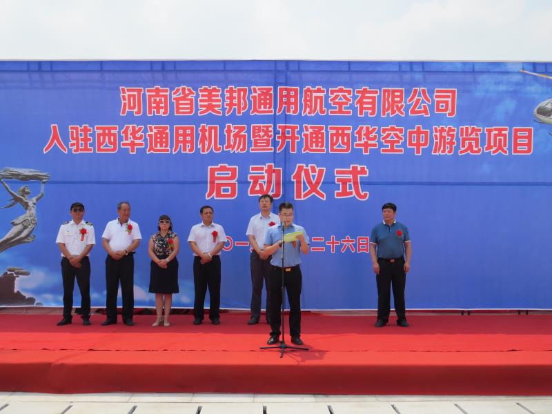 8月26日,河南省美邦通用航空有限公司入駐西華通用機場暨開通西華空中游覽項目啟動儀式在西華縣南廣場舉行,西華縣委常委、常務(wù)副縣長王獻超,西華縣人大常委會副主任龐友敬,西華經(jīng)開區(qū)管委會主任宋廣良,西華經(jīng)濟技術(shù)開發(fā)區(qū)城市投資有限公司總經(jīng)理朱洪江;美邦控股集團總經(jīng)理、河南省美邦通用航空有限公司董事長王洪濤等出席啟動儀式。