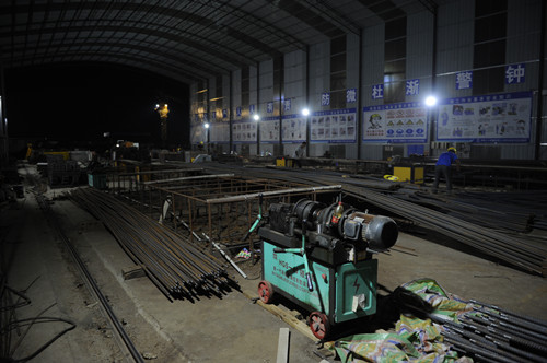 當晚21時許,記者在泰和家園施工現(xiàn)場看到,鋼筋加工棚的工人們正在進行鋼筋的切割,他們在為明天施工準備鋼筋材料。A1#樓正在進行墊層的澆筑工作,A8#樓正在進行負一層及周邊地庫的鋼筋綁扎及模板加固工作,A9#樓正在進行負一層墻柱鋼筋及模板內(nèi)架搭設(shè)工作?,F(xiàn)場2臺鋼筋切割機在不停地運轉(zhuǎn),9臺塔吊在持續(xù)工作,40余名施工人員在場地內(nèi)各司其職,緊張而有序地趕進度,整個施工現(xiàn)場如火如荼。