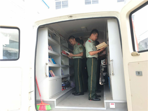 文化擁軍是商水縣圖書館的優(yōu)良傳統(tǒng)。當天,流動圖書車一來到縣武警中隊駐地,士兵們便不約而同圍了過來,有的走上圖書車尋找喜愛的圖書,有的則直接坐在車上,認真翻閱書籍。戰(zhàn)士小劉表示:“我最喜歡人物傳記方面的圖書,今天他們送來了許多。我要充分利用這些圖書,讀好書、立好志、當好兵,為實現(xiàn)中國夢、強軍夢和祖國的國防建設作出應有貢獻?!?/p>