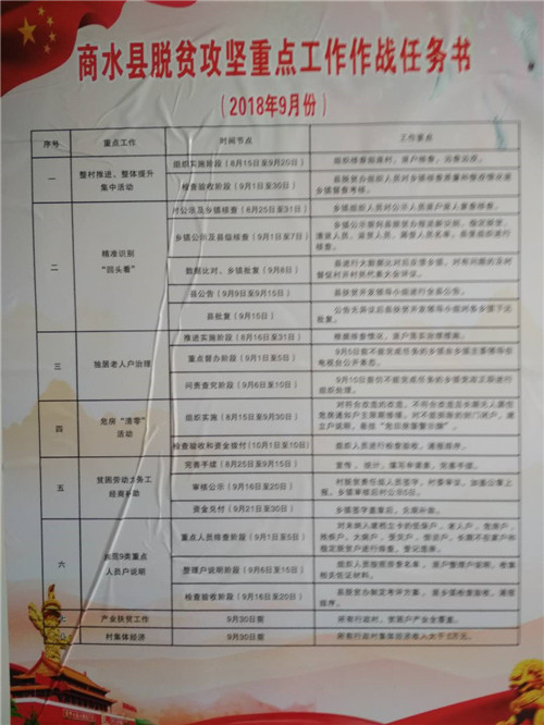 “‘脫貧攻堅重點工作作戰(zhàn)任務(wù)書’既是作戰(zhàn)圖、也是軍令狀,每個時間點開展哪些工作、達(dá)到什么效果、采取何種措施,都在‘作戰(zhàn)任務(wù)書’上顯現(xiàn)了出來?!?月5日上午,商水縣練集鎮(zhèn)朱集村脫貧責(zé)任組組長陳書敬指著張貼在村辦公室內(nèi)的“商水縣脫貧攻堅重點工作作戰(zhàn)任務(wù)書”說。