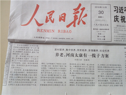 為助力脫貧攻堅,有效提高農(nóng)村特困老人整體供養(yǎng)水平,太康縣民政局、縣扶貧辦等部門在縣委、縣政府正確領(lǐng)導(dǎo)下,按照“一戶一策、一人一法”原則,創(chuàng)新實施集中供養(yǎng)、親情贍養(yǎng)、社會托養(yǎng)、居村聯(lián)養(yǎng)、鄰里助養(yǎng)“五養(yǎng)”模式,有效破解了特困老人的脫貧和養(yǎng)老難題。該做法經(jīng)《周口日報》率先報道后,國家級、省級媒體紛紛慕名前往太康采訪。截至目前,百余家媒體或網(wǎng)站相繼報道了太康“五養(yǎng)”模式。10月30日,《人民日報》《光明日報》分別以《養(yǎng)老,河南太康有了一攬子方案》《河南太康:“五養(yǎng)”模式破解特困人員養(yǎng)老難題》為題重磅介紹了太康“五養(yǎng)”模式經(jīng)驗。10月30日,人民日報海外版官方網(wǎng)站還以《河南太康:“五養(yǎng)”模式來了 特困人員笑了》為題作了報道。據(jù)了解,國家級3家主流媒體同一天內(nèi)報道同一工作經(jīng)驗,在太康縣宣傳史上尚屬首次。