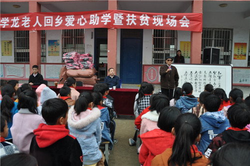 雖然身在北京,但于學(xué)龍老人的心始終牽掛著故鄉(xiāng)。11月5日,他回到老家商水縣黃寨鎮(zhèn),用自己的退休金,為母校埠口小學(xué)的孩子送來(lái)一批嶄新的書包和自己創(chuàng)作的書法精品?!坝H愛(ài)的小校友們,你們背上書包上學(xué)就更方便了,希望你們好好學(xué)習(xí)、茁壯成長(zhǎng),將來(lái)成為社會(huì)棟梁,報(bào)效國(guó)家?!庇趯W(xué)龍對(duì)孩子們說(shuō)。
