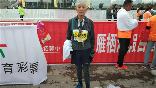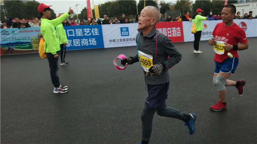 當日上午10時許,孔祥義老人堅持跑完了半程馬拉松21.0975公里的路程,臉上露出滿意的笑容。