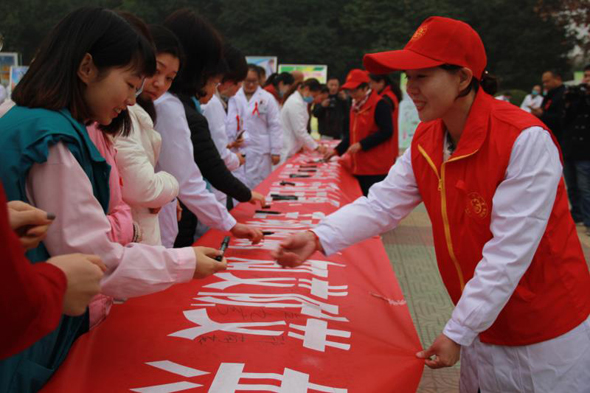 圖為在趕來參加活動的群眾和醫(yī)護人員共同在預(yù)防艾滋病百米長卷上簽名。