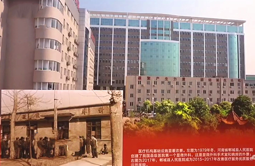 河南電視臺記者陳貞君在展覽板前介紹,這里是位于第四展區(qū)的兩幅同一所醫(yī)院的照片——河南省鄲城縣人民醫(yī)院,這張是1979年冬天,鄲城縣人民醫(yī)院創(chuàng)建了我國縣級醫(yī)院第一個顯微外科,這就是當時的顯微外科的手術(shù)室和病房的外景,這張是2017年的鄲城縣人民醫(yī)院。可以說改革開放讓同一所醫(yī)院有了滄海桑田般的變遷。
