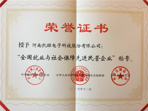 12月20日上午,記者獲悉在全國召開的就業(yè)與社會保障先進民營企業(yè)暨關(guān)愛員工實現(xiàn)雙贏表彰大會上,我市民營企業(yè)河南凱旺電子科技股份有限公司榮獲“全國就業(yè)與社會保障先進民營企業(yè)”稱號,中華全國工商業(yè)聯(lián)合會、中華人民共和國人力資源和社會保障部、中華全國總工會為該企業(yè)頒發(fā)了榮譽證書。