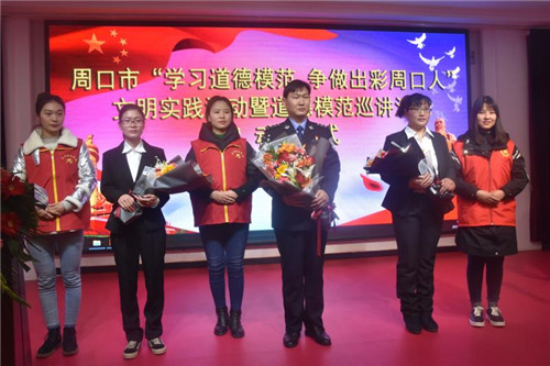 市公安局交警王凱偉是2018年敬業(yè)奉獻(xiàn)類中國好人,省五四獎(jiǎng)?wù)芦@得者,經(jīng)常參加公益活動(dòng),持續(xù)幫助貧困女孩小夢(mèng)麗和她家人,用善舉挽救了這個(gè)貧困家庭。扶溝縣曹里鄉(xiāng)刁灣小學(xué)教師李艷琴扎根鄉(xiāng)村教育一線無怨無悔,數(shù)年如一日照顧癱瘓?jiān)诖驳钠牌湃蝿谌卧?,曾獲縣最美鄉(xiāng)村老師稱號(hào)。鹿邑伯陽中學(xué)“90后”女教師劉交交剛參加完高考后父親因病去世,母親身患?xì)埣?。她不向命運(yùn)低頭,靠打工收入和微薄的助學(xué)金維持生活和學(xué)業(yè),為照顧母親,她攜母上大學(xué),曾獲中國大學(xué)生自強(qiáng)之星等稱號(hào),被授予省五四獎(jiǎng)?wù)?。三位道德模范雖然都是最平凡的人,但都有一顆不平凡的心,他們的感人事跡散發(fā)著奪目的光芒,深深感染了現(xiàn)場(chǎng)的每一位聽眾,不少人流下了感動(dòng)的淚水。