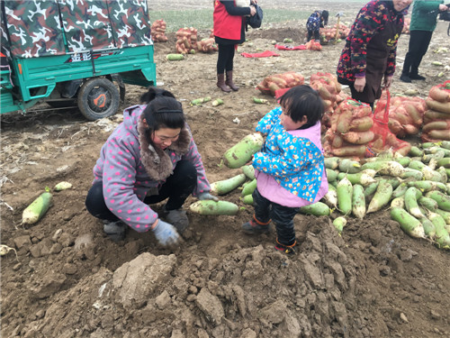 走在淮陽(yáng)縣劉振屯鄉(xiāng)張老家村的田間地頭,記者看見劉玉梅正將蘿卜從地里扒出來裝車,她的小侄女也幫起忙來,吃力地抱起了一個(gè)大蘿卜。 記者 王凱 攝