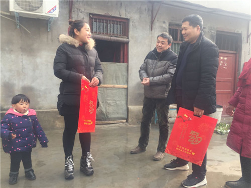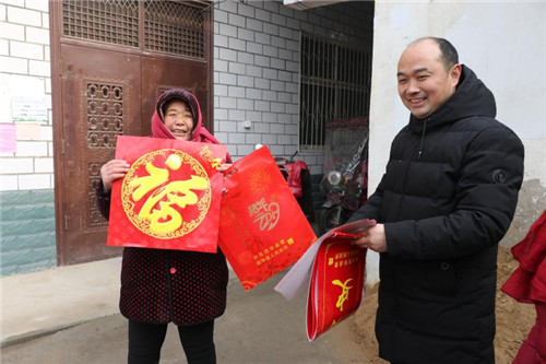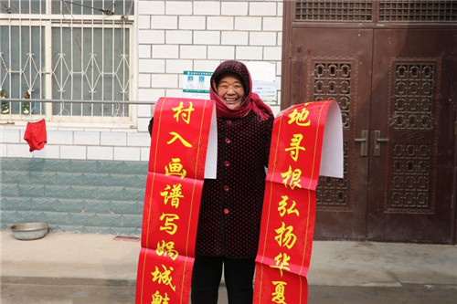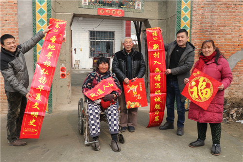 1月16日,西華縣艾崗鄉(xiāng)鐵爐村村民馬永清接過該縣縣委宣傳部駐村扶貧干部送來的春聯(lián)喜上眉梢。據(jù)了解,今年春節(jié)前夕,該縣財政投入200余萬元購置80萬副春聯(lián)在全縣鄉(xiāng)村范圍內廣泛開展贈春聯(lián)、送祝福活動。