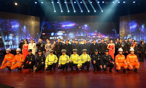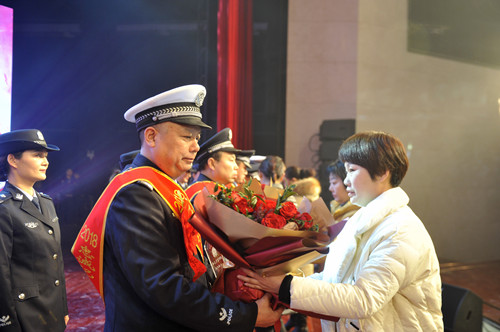 晚會現(xiàn)場,頒獎環(huán)節(jié)和文藝節(jié)目輪番呈現(xiàn),精彩紛呈。由32個民警子女上演的情景劇《天之大》,警寶們用稚嫩的聲音唱出了警察家庭的付出和他們對父母的愛,讓現(xiàn)場觀眾流下感動的淚水;最后一個頒獎環(huán)節(jié),當(dāng)15名警嫂手捧鮮花獎杯走上舞臺為他們從警10年、20年、30年的愛人頒獎時,整個舞臺愛意濃濃。