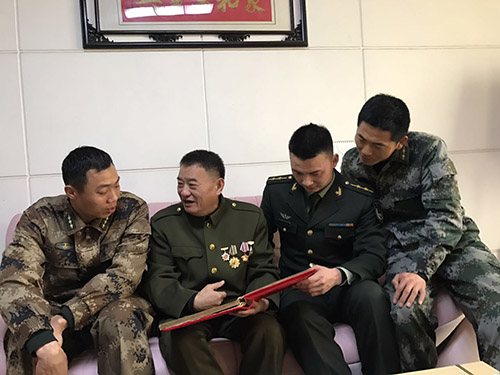 柳東坡、劉威、崔二偉3名年輕軍官聽(tīng)完老英雄的講述后心靈受到極大震撼,一度落下激動(dòng)地淚花。他們向海水干匯報(bào)了各自在部隊(duì)立功受獎(jiǎng)的情況。“強(qiáng)軍先鋒”柳東坡現(xiàn)為80集團(tuán)軍某旅副營(yíng)長(zhǎng),在斯洛伐克國(guó)際特種兵比武、中俄聯(lián)演以及全軍特種兵比武中表現(xiàn)優(yōu)異,先后榮立一等功、二等功各一次,三等功3次;“天山兵王”劉威現(xiàn)任新疆軍區(qū)某團(tuán)副連長(zhǎng),在國(guó)際軍事比賽、軍區(qū)偵察兵比武中脫穎而出、成績(jī)顯著,入伍來(lái)先后榮立一等功、二等功各一次,三等功2次;“狙擊神槍手”崔二偉曾被總參謀部表彰為“全軍優(yōu)秀狙擊手”,先后榮立一等功、二等功各一次。