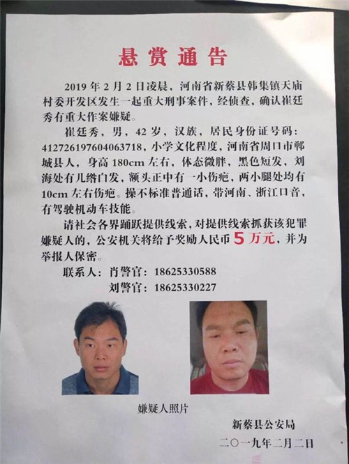 2月2日凌晨,駐馬店新蔡縣韓集鎮(zhèn)發(fā)生一起重大刑事案件,犯罪嫌疑人崔某因懷疑其妻子與受害人楊某有不正當(dāng)關(guān)系,午夜駕車沖進(jìn)受害人楊某的居住地放火將其殺害,犯罪嫌疑人崔某趁夜色潛逃。新蔡縣公安局黨委啟動重大刑事案件偵破機(jī)制,緊急發(fā)布公安協(xié)查通報,請求兄弟單位協(xié)助抓捕。并發(fā)布懸賞通告,懸賞5萬元通緝崔某。結(jié)合犯罪嫌疑人崔某可能逃跑路線,新蔡警方先后輾轉(zhuǎn)溫州、青島、臨泉、周口等地開展抓捕工作,均未果。