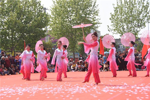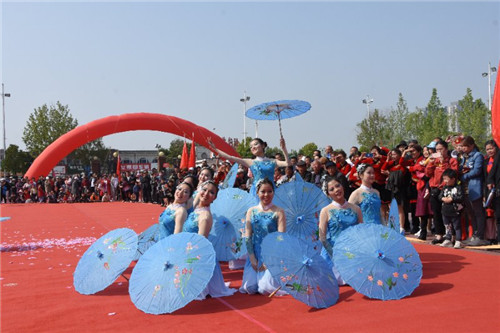 比賽進(jìn)行到將近一半時候,縣第二實(shí)驗(yàn)小學(xué)參賽隊(duì)帶來的舞蹈《麗人行韻》將大賽推向了高潮。表演開始,身著天藍(lán)漸變色長裙的38名姑娘手持彩傘一字列隊(duì)緩步入場,正當(dāng)觀眾們看得入神時,她們突然將彩傘都齊刷刷地舉過頭頂并瞬間打開,無數(shù)粉紅色的花瓣從彩傘中紛紛飄落,像從碧藍(lán)的天空中下起了無盡的花瓣雨。選手們短短幾秒鐘的舉動,在廣場上勾勒出了一個人間仙境,引人入勝。在粉紅花瓣的映襯中,傘下腳步輕盈的女子們微微舞動,美若天仙,婀娜多姿,展現(xiàn)了“人面桃花相映紅,桃花依舊笑春風(fēng)”的作品主題。