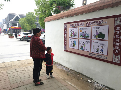 “一走出校門,就會(huì)看到關(guān)于創(chuàng)衛(wèi)內(nèi)容的文化墻,真是將文明知識(shí)送到我們心坎里了?!薄霸裙舛d禿的墻,現(xiàn)在會(huì)說話了,我們的城市也越來越美了?!币蝗褐軒煷髮W(xué)生歡笑著走過文化墻。