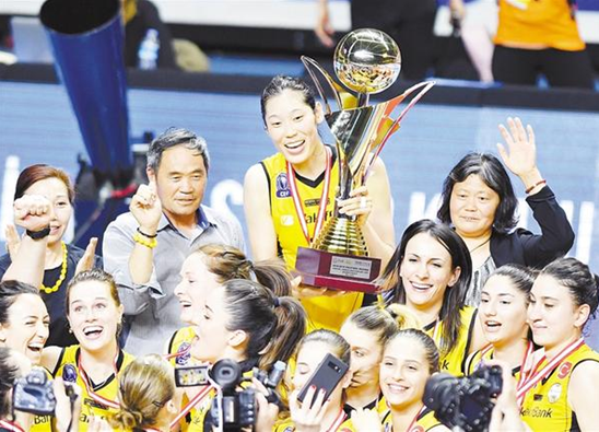 5月5日,瓦基弗銀行隊球員朱婷(中上)邀請父母進入球場慶祝奪冠。 當日,在2018-2019賽季土耳其女排超級聯(lián)賽決賽第五回合比賽中,瓦基弗銀行隊客場以3比0戰(zhàn)勝伊薩奇巴希隊,以總比分3比2成功衛(wèi)冕聯(lián)賽冠軍。朱婷也蟬聯(lián)了聯(lián)賽MVP(最有價值球員)稱號。 新華社記者 徐速繪 攝
