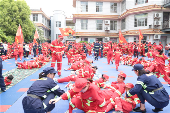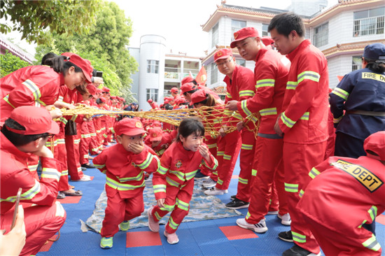 記者在現(xiàn)場看到,數十名老師分工明確,變身為“消防教官”;千名孩子隊列整齊,成為“小小消防員”;家長則相伴左右,擔任“大大消防員”的角色。演練從“火災”現(xiàn)場撤離拉開序幕,消防健身體操、火場逃生、攀爬通過軟橋、打滾自救、滅火實驗,還有催人淚下的兒童防走失演練“小蝌蚪找媽媽”。“小蝌蚪找媽媽”活動是讓孩子們無人引導的情況下,在所有家長穿著相同、戴著帽子、戴著眼罩的茫茫人海中找爸爸媽媽。