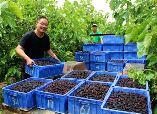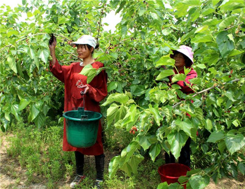 除此之外,桑果的采摘全靠人工,是勞動密集型產(chǎn)業(yè),需要大量當(dāng)?shù)氐膭趧恿?,每到采摘季?jié),公司都會招用周邊200余名村民到種植基地務(wù)工,僅此一項,為每名務(wù)工人員人均增收3000余元?!鞍吃谝嫫飞i┓N植基地采摘桑椹,每天都有100多元的收入?!苯衲?3歲的黃橋鄉(xiāng)孫堤村留守婦女趙美容高興的說。