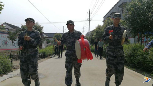 儀式結(jié)束后,丁有亮一行跟隨者武裝部工作人員,敲著鑼打著鼓走向軍屬代表家庭現(xiàn)場(chǎng)為他們懸掛軍屬光榮牌。
